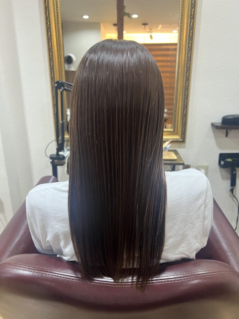 今回は、お客様の髪の状態に合わせて、髪の内部に栄養を補いながら、表面のキューティクルを整える髪質改善トリートメントを行いました。